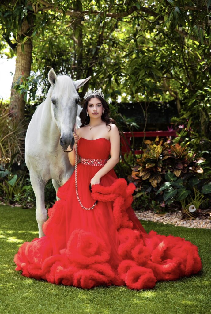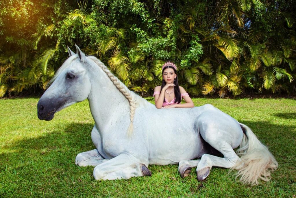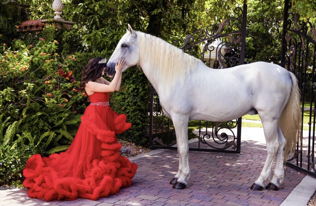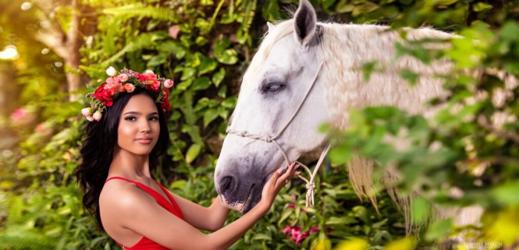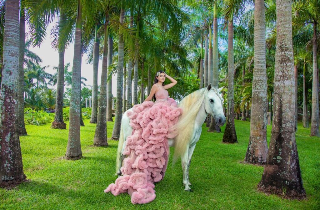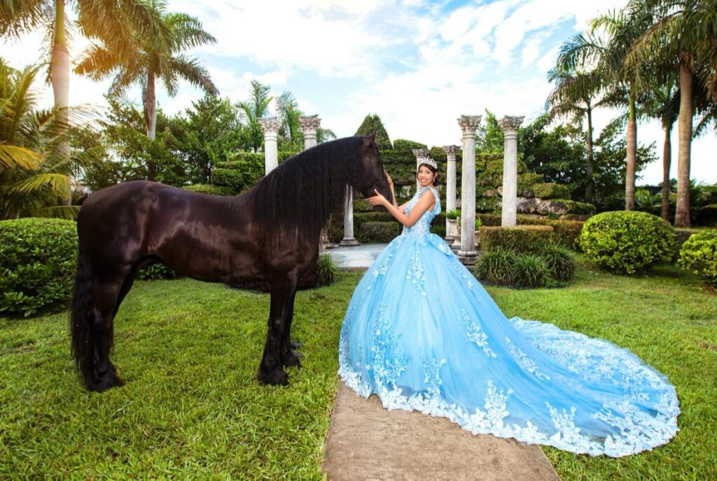 Los caballos son símbolo de poder y nobleza. En las fotos de quinceañera con animales, se convierten en el reflejo perfecto de la fuerza femenina y la elegancia en movimiento.