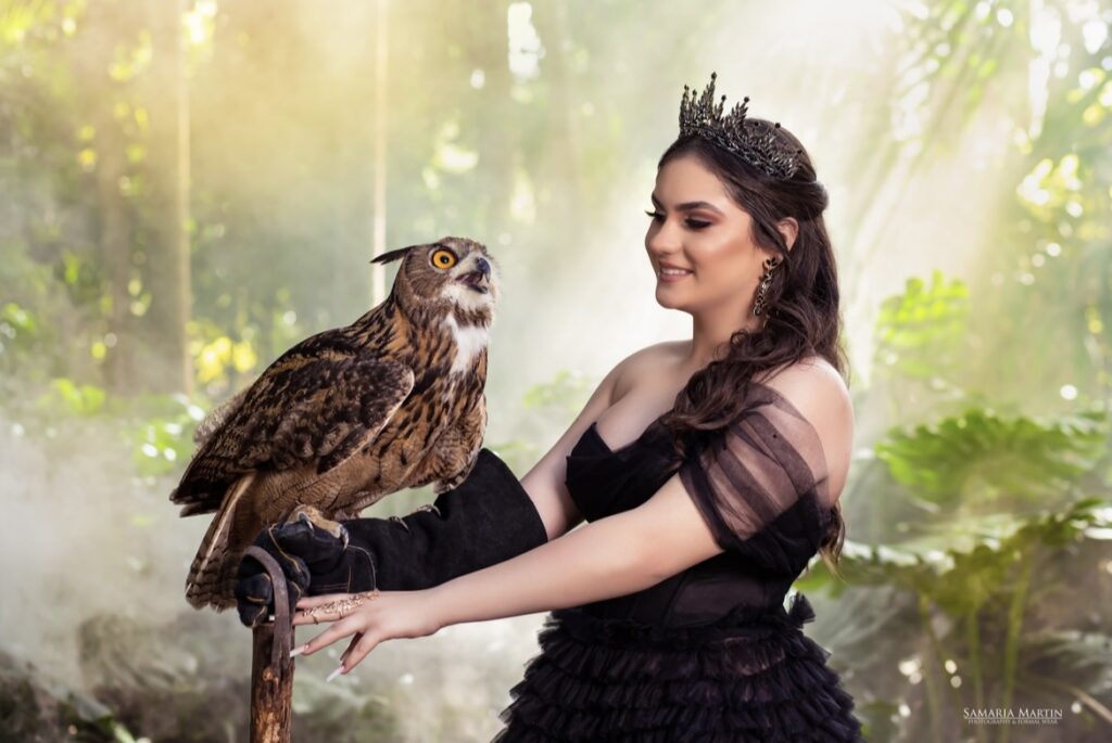 El búho aporta un aire de sabiduría y misticismo: mirada intensa, poses serenas y luz lateral para resaltar texturas. Ideal en claustros o jardines formales; suma capa y guantes para un look editorial. Perfecto para fotos de quince con animales con estética sofisticada.