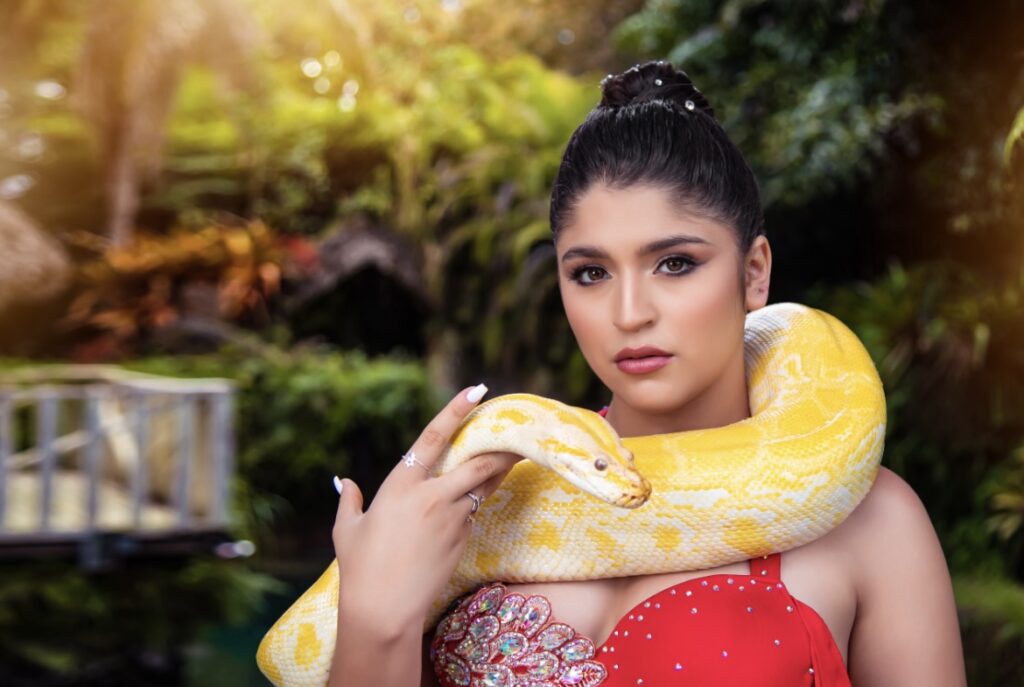 La serpiente comunica control y seguridad: manos firmes, barbilla alta y respiración tranquila. Funciona en interiores con luz controlada o fondos de piedra; evita accesorios sueltos. Gran opción para una sesión de quinceañera con animales de carácter.